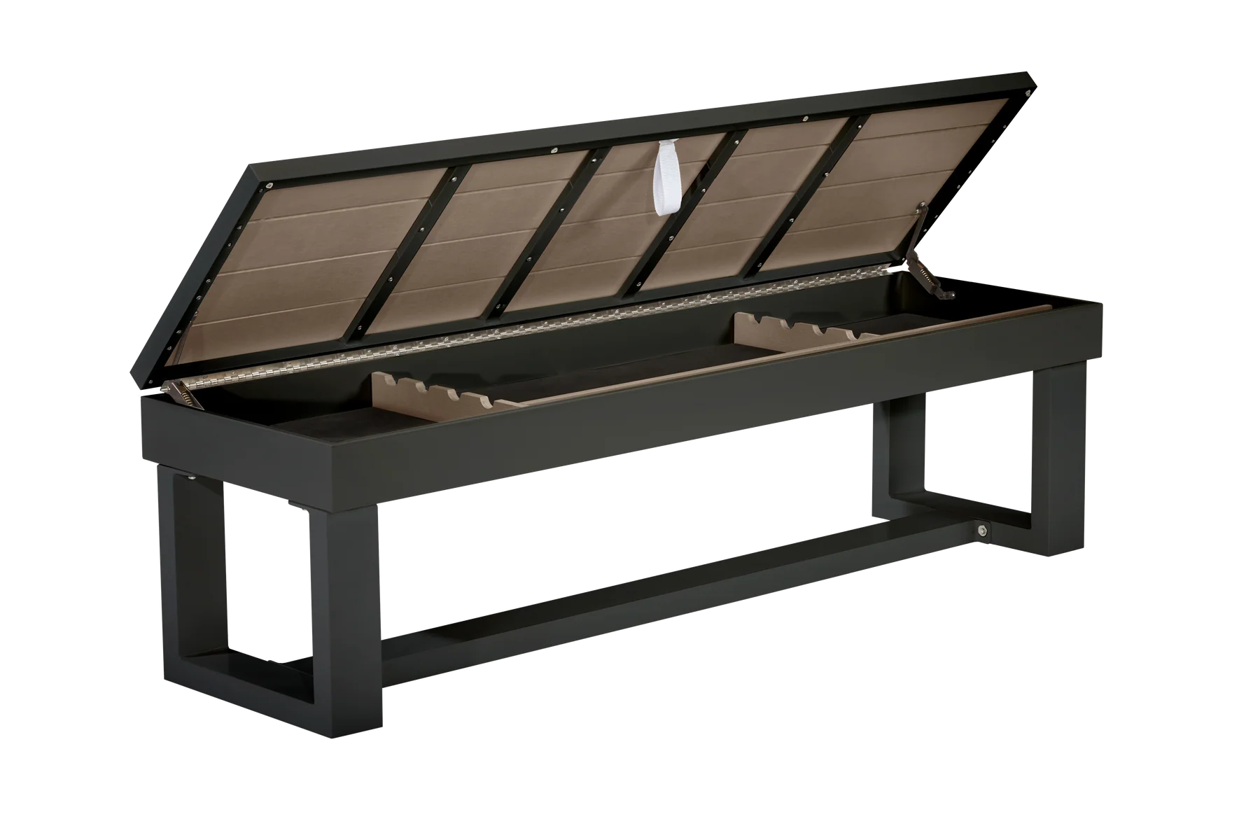 Lanai 8′ Outdoor Pool Table, coordinating storage benches x2